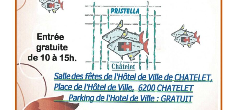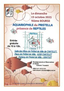16ème bourse aquariophile du Pristella10 h 00 min - 15 h 00 minLe dimanche 19 octobre 2025 le Pristella organise sa 16ème bourse aquariophile. Présence de reptiles.Salle des fêtes de l'Hôtel de ville de Chatelet, place de l'hôtel de ville 6200 Chatelet