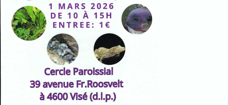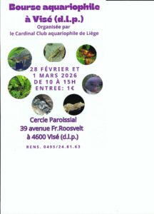 10 h 00 min - 15 h 00 minBourse aquariophile du Cardinal le 28février 2026de 10h à 15h39 avenue Fr. Roosevelt à 4600 ViséEntrée: 1eurorenseignements: 0495-248163Cercle Paroissial