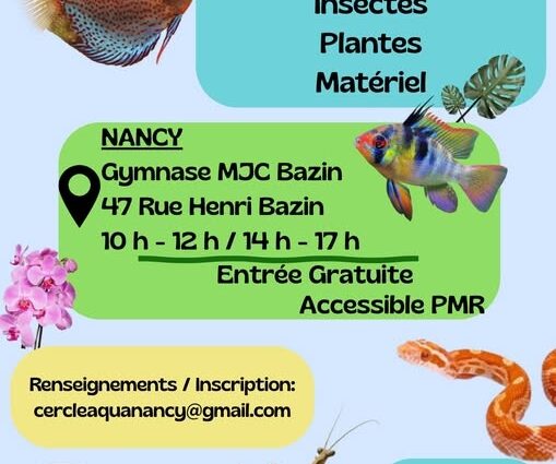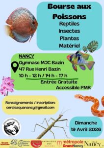 Le dimanche 19 avril 2026 de 10h à midi et de 14h à 17h, le cercle aquariophile de Nancy organise une bourse aux poissons, plantes, reptiles, insectes et matériel au Gymnase MJC Bazin 47 rue Henri Bazin.