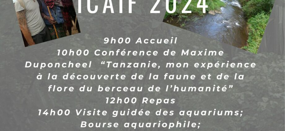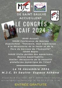 Le 16 novembre 2024 l'association l'Aquario de Saint-Saulve organise le congrès ICAIF à la maison des jeunes et de la culture de Saint-Saulve place du 8 mai 1945. Conférence par Maxime Duponcheel "Tanzanie, mon expérience à la découverte de la faune et de la flore du berceau de l'humanité" . Repas convivial à réserver avant le 4 novembre. Visite des installations aquariophiles et de l'espace plantes de l'Aquario en autres activités