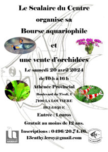 Le Scalaire du Centre organise sa bourse aquariophile10 h 00 min - 16 h 00 minLe Scalaire du Centre organise sa bourse aquariophile et une vente d'orchidéesAthénée provincial