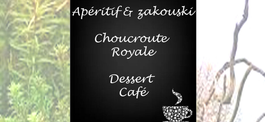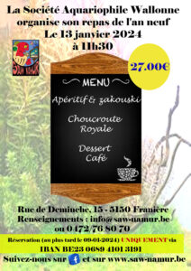 2024-01-13Repas de l'an neuf de la SAW11 h 30 minAu menu: Apéritif et Zakouski Choucroute Royale Dessert -Café prix : 27 euros Rue Deminche , 15 5150 Franière Bourses aquariophiles 2025-11-28